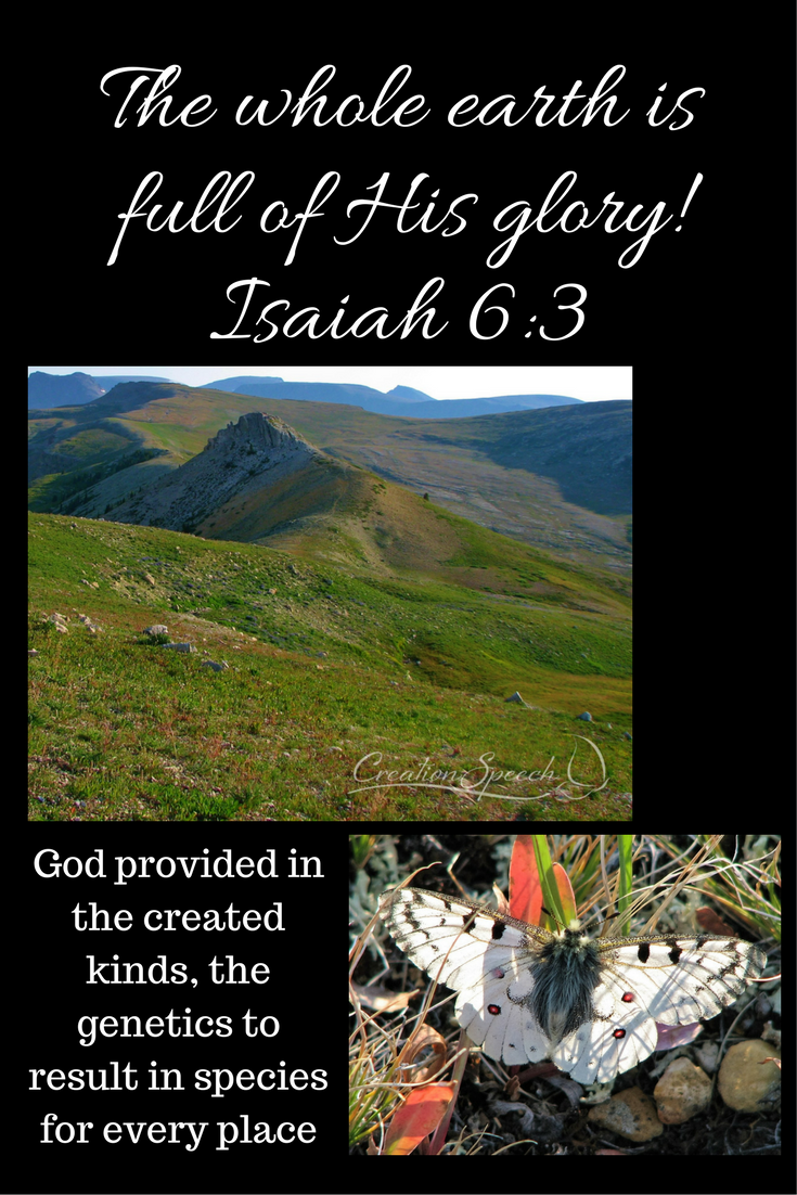 The Rocky Mountain Parnassian butterfly is well suited to live at a 10,000-foot elevation. I saw them warming up in the meadow pictured below on a cool morning in the Beartooth Mountains, Wyoming. The dark hairy body was surrounded by a black patch to absorb and retain the heat of the sunlight. The larva hatches from an overwintering egg and feeds on succulent Stonecrop leaves and flowers. Stonecrop also does well at this elevation where the soil stays moist. The larva hibernates through the winter so it can grow to full size in a later summer when it transforms into a pupa protected by a loose silken web. Like other larva in the swallowtail family, the Parnassian larva has a retractable organ called an osmeterium that emits a predator-repelling smell. The Rocky Mountain Parnassian butterfly is one of many animals including birds, elk, and goats that are at home in the mountains. It appears that God provided in the created kinds the genetics to result in species for every place. The whole earth is full of His glory.