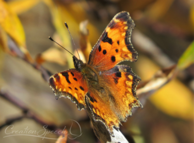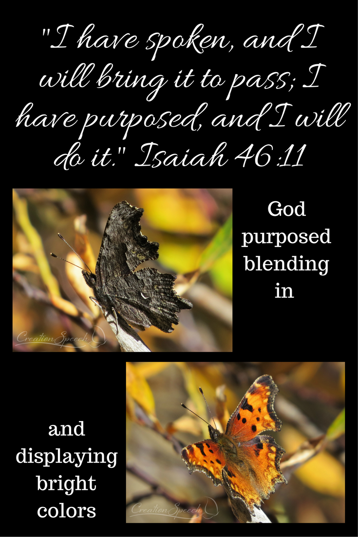 I went on a special trip with my daughter to see the fall colors in September on the Jim Creek Trail, Winter Park, Colorado (9200-foot elevation). The trees were spectacular, and we saw a butterfly, the Hoary Comma. Its wings were open to the bright sunshine immediately grabbing our attention. The diffuse pattern in the tails of the lower wings is an artistic wonder. I approached closer to the butterfly, and it quickly closed its wings and became much less visible. It is amazing that such a thin wing structure can have such a different pattern on the two sides.  To recognize danger is also fascinating. It is plain that God purposed the butterfly with both the instinct and patterns to blend with the surroundings and to display beauty. Also, God created the black currant plant to double in purpose as the host plant for the Hoary Comma caterpillar and the producer of berries rich in healthful anthocyanins and flavanols. Nothing is too hard for God (Jeremiah 32:17b).